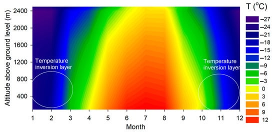 The average annual, warm, and cold season MLHs were 613.2, 859.7, and 366.3 m, respectively. Monthly MLH varied from 194.7 to 364.9 m due to air sinking under the near-surface temperature inversion layer in the winter, while it was approximately 899.2–1103.7 m due to surface heating in the summer months (Figure 11a and Figure 12). The locations of the MLH and the top of the temperature inversion layer in the winter are shown in Figure 12a, while its seasonal locations appear in Figure 12b.