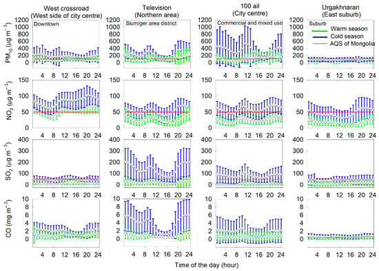 Diurnal variations in air pollutants in the different land use areas of Ulaanbaatar city in the warm and cold seasons from 2019 to 2020. The blue and green lines correspond to the cold and warm seasons; the red line is the Mongolian AQS for pollutants.