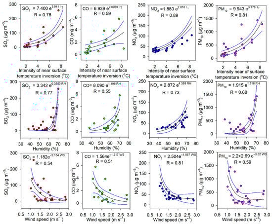 Figure 14 shows the correlations between monthly average meteorological variables, such as wind speed, relative humidity, the intensity of near-surface temperature inversion, and concentrations of air pollutants, such as PM10, NO2, SO2, and CO. Although meteorological variables and air pollutants were synchronically measured at each air quality monitoring station, the effects of atmospheric stagnation and ventilation conditions were studied by plotting data from the West crossroad air quality monitoring (AQM) and Ulaanbaatar radiosonde stations (Figure 14). The data quality of the West crossroad AQM station was better than of the other stations near the radiosonde station. All pollutants demonstrated a moderate to high positive correlation with relative humidity (R = 0.55–0.77, p < 0.05) and temperature inversion intensity (R = 0.59–0.89, p < 0.01) and a moderate to high negative correlation with wind speed (R = 0.51–0.81, p < 0.05).
