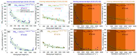 Dependence of monthly average mixing layer height (a,b,e,f) and ventilation coefficient (c,d,g,h) on PM10 and PM2.5 particles in the western part of the city center (West crossroad station) in the morning and evening from 2019 to 2020. The solid line is the regression line, while the dotted green lines are the 95% confidence band. The colored patterns in panels (c,d,g,h) are air pollution potential categories: a shift from darker to lighter colors corresponds to a decrease in air pollution potential, indicating cleaner air.