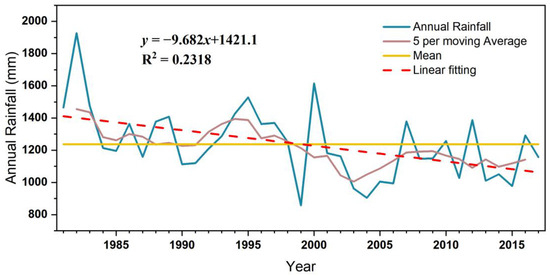 Annual rainfall trend. Source: computed from wind records across hydrological stations in the area, 2022.