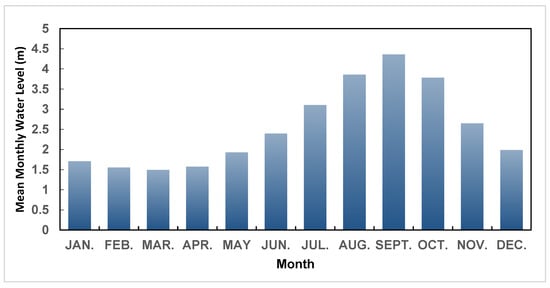 This detected trend warrants concern as it suggests a potential rise in water flow, leading to potential flood risks in areas along major rivers. Furthermore, it could affect agriculture, specifically irrigation and fish farming, and may necessitate the relocation of residents. The peak annual water discharge and level were recorded in September, with mean values of 1309.39 m/s and 4.36 m, whereas the lowest values were observed in April and March, respectively. This pattern corresponds to the rainy season peak—usually in August and September—and the dry season—around March and April. During the dry season, elevated temperatures could accelerate evapotranspiration rates and reduce water levels, as observed by Ezra et al. [13].