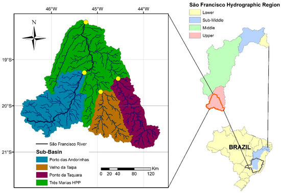 The basin chosen for this study is located in the Upper São Francisco River basin in Minas Gerais State, in southeastern Brazil. It flows to the section of the São Francisco River where the Três Marias HPP dam is located. The basin has a total drainage area of 50,946 km² and contains important tributaries of the São Francisco River. It was subdivided into four sub-basins that have gauging stations with reliable databases (Figure 2). These four stations were used to calibrate the hydrological model.