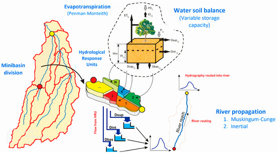 The MGB-IPH (Large Basin Model of the Hydraulic Research Institute) is a distributed conceptual model used to simulate the process of transforming rainfall into large basin stream flows, generally larger than 10,000 km² [27]. The discretization of the hydrographic basin within the model is performed in irregular units called mini-basins [28]. The mini-basins are then subdivided into hydrological response units (HRU), which represent the spatial variability of the hydrological behavior. The HRU are based on soil characteristics and vegetation coverage [7,27,28]. In addition to the physical characteristics, the model also needs hydrological and meteorological information as input data. The MGB-IPH [29] is composed of algorithms for water balance, evapotranspiration (Penman–Monteith), surface, sub-surface, and subterraneous runoff in the cell, and drainage in the river network (Muskingum–Cunge or Inertial). A summary of MGB functioning is presented in Figure 3.