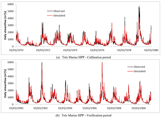 Results of MGB-IPH model: (a) calibration and (b) verification for Três Marias HPP.