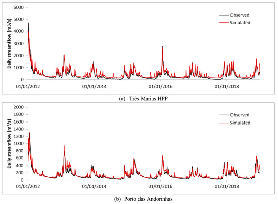 There is a long historical record of drought occurrences in the São Francisco River basin. The most recent was registered between the years 2012 and 2018, standing out for being one of the longest and most intense drought periods in the basin [46]. For this reason, the performance of the MGB-IPH model was also assessed for this period of years. This assessment is particularly important since projections of climate models indicate occurrences of similar conditions in the periods of the future. Figure 5a shows the result for Três Marias HPP. The hydrological model overestimates stream flows in almost every year. However, in the sub-basin corresponding to the Porto das Andorinhas station, this overestimation does not occur (Figure 5b). The most likely explanation for this difference is that in the basin upstream of Porto das Andorinhas there is no significant water consumption. In the case of the other sub-basins, there is the consumption of water by the metropolitan region of Belo Horizonte (more than 2.5 million inhabitants) and extensive areas of irrigated agriculture implemented in the last 20 years. As the MGB-IPH model was calibrated for a period when irrigation was insignificant and the population was smaller, the result is an overestimation of flows in recent years. But despite this, the model responded very satisfactorily to this period with much below average rainfall, which is quite similar to the projections generated by the climate models.
