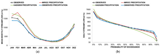 First, simulations were carried out for the Present (1961–1990) period to verify the behavior of the simulated stream flows when the MGB-IPH model assimilates the projections of the climatic models after bias correction. In Figure 6a, it is possible to observe that both models, Eta-MIROC5 and Eta-HadGEM2-ES, adequately simulated the seasonality of the basin. The blue line represents the flows generated from the simulation of the MGB-IPH model with the rainfall observed in the basin. It appears that this simulation is close to the observed values, but in the months of higher flow there is an underestimation (Figure 6a). The simulations with the precipitation of the climate models show overestimates in the months from January to May. This occurs even after bias corrections, due to the non-linearity of the processes of transforming rain into flow. That is, the differences in relation to the observed precipitation are amplified in the simulated flows. However, these overestimations do not interfere with the projection’s evaluations, since the flows of the future periods are not compared with the observed flows of the present period.