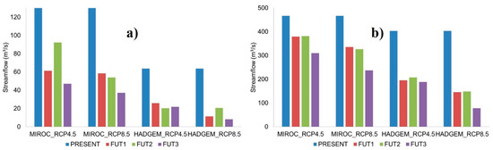 Comparison between the simulated stream flows for the Present and the future periods for the RCP4.5 and RCP8.5 scenarios: (a) Q95%; (b) Q50%.
