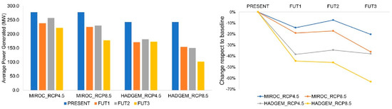 The power generated by the Três Marias HPP was determined for the periods under analysis by taking the stream flow projections from the previous analysis. Figure 9 shows average power generation for future periods relative to the Present period. There was a tendency towards similar stream flows, and therefore, there were reductions in generation. It is important to note that average power reductions were greater than reductions in stream flows. This is mainly due to the reservoir, which facilitates a planned dispatch to control the potency dependent turbine inflow—which in turn depends on the reservoir volume/water level, operational decisions, maximum turbine discharge, etc.—and not just from the inflow. The results clearly show that the Eta-HadGEM2-ES model was the most pessimistic and showed reductions above 30% in both scenarios. I worst case is for FUT3 in scenario RCP8.5, with 60% reduction on average power generation, corresponding to almost 100 MW. The Eta-MIROC5 model is less pessimistic, as most variations were between −7% and −20%.