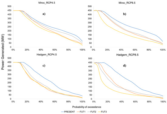Duration curve of power generated (MW) simulated for Present, FUT1, FUT2, and FUT3 periods: (a) Eta-MIROC5 → RCP4.5; (b) Eta-MIROC5 → RCP8.5; (c) Eta-HadGEM2-ES → RCP4.5; (d) Eta-HadGEM2-ES → RCP8.4. Discussion.