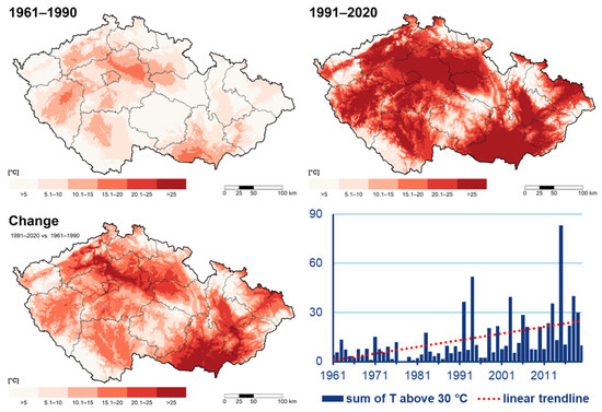 Average sum of daily air temperatures above 30 °C in periods 1961–1990 (top left) and 1991–2020 (top right); difference between 1991–2020 and 1961–1990 (bottom left). Trend of sum of daily air temperatures above 30 °C in the 1961–2020 period in Czechia (bottom right).
