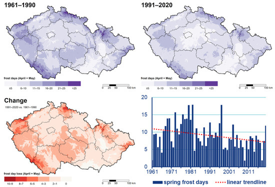 Average number of days with frost in April–May in the period 1961–1990 (top left) and 1991–2020 (top right); difference between 1991–2020 and 1961–1990 (bottom left). Trend of days with frost in April–May during 1961–2020 in Czechia (bottom right).