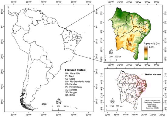 The NEB encompasses nine states of the Brazilian federation, covering an area of approximately 1.6 million km2 [21]. The NEB is in the equatorial zone, and thus presents a precipitation regime typical of this zone.