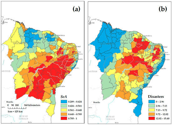 In Figure 2, the agricultural sensitivity component, drought extremes (SeA) and the spatial distribution of the data for drought disasters are displayed. The spatialization of the agricultural component sensitivity to dry events, obtained through the statistical multivariate technique factorial analysis (FA), is presented in Figure 2a. A high probability of SeA is observed in almost the entire NEB, mainly in the center-south and southeast areas, with values ranging from 0.709 to 1. However, the northwest part of the NEB presents the lowest values, ranging from 0.203 to 0.594.