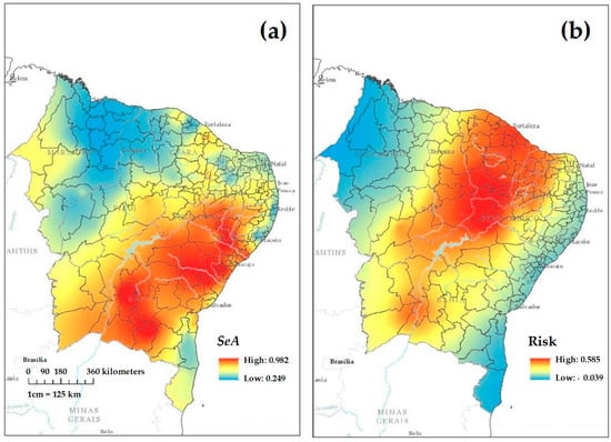 Due to the fact that the precipitation stations do not cover all the micro-regions, as can be observed in Figure 1, there was a need to use an interpolation technique, specifically kriging, in order to obtain the agricultural risk to extreme drought events (Rdrought), using Equation (3), and presented in Figure 3b, as well as for the punctual evaluation of the SeA, Figure 3a.