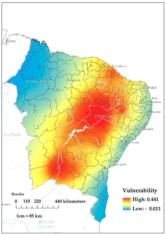 The main consequences of drought in the NEB are agricultural losses and water shortage for human and animal consumption. Through civil defense, city administrators determine a state of emergency through drought decrees, and federal resources are made available in order to counteract the effects of droughts. One of the most commonly used strategies to cope with drought in the region, supported by the federal resources above mentioned, is the distribution of water via tank trucks. Risk-related vulnerability is widely disseminated in the IPCC AR5 and cited by [25], and is calculated using the following expression: