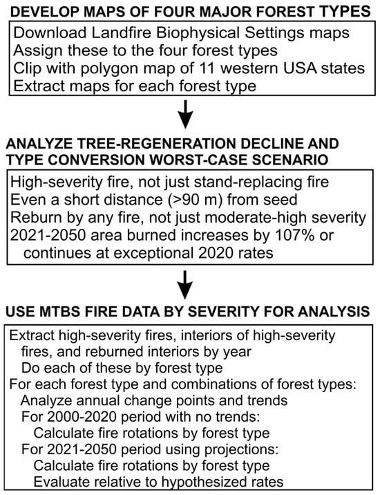 First, a synopsis of methods and the flow of work (Figure 1) are discussed. I directly measured the rates (fire rotations, FRs) and patterns of high-severity fires that are leading to reduced tree regeneration and potential type conversion. I used federal government maps of high-severity fires in four major types of forests (dry pine, dry mixed conifer, moist mixed conifer, subalpine) covering ~56 million ha of 11 western USA states. This is about 80% of ~69 million ha of western forests, based on Wickham et al. []. After measuring the annual area burned at high severity from 1984 to 2020 and testing for change points and trends, I used the 2000–2020 period, which lacked trends (see Section 3) and had more burned area than prior to 2000, for all analyses. Since there has been variability in the effects of climate change on tree regeneration in burned areas [,], I then used these data to estimate fire rotation (FR), the expected period to burn across an area equal to the area of each of these four types of forests. FR is the most accurate measure of fire rates, since fires vary in area and earlier methods (e.g., mean fire-return interval) are typically based on just counts of fires [,]. FR is estimated for the study period as 21 years divided by the fraction of total area of a forest type that burned (sum of all individual fire areas) over the 21 year period. Therefore, for example, if 20% burned in 21 years, then 21/0.20 would be equal to an FR of 105 years. For each of the four forest types, I estimated FRs for: (1) total high-severity fire area, (2) interior high-severity fire area, and (3) reburned interior high-severity fire area.