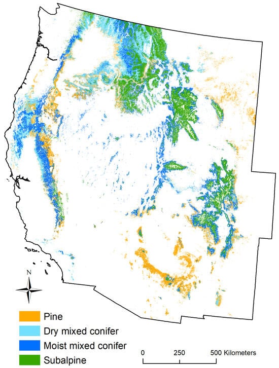 The estimated historical distribution and extent of these forests was identified by Landfire Biophysical Settings (BPS) maps from 2020 (https://landfire.gov/version_download.php, accessed on 4 April 2023). I used detailed descriptions [] to place Landfire Ecological Systems into these four forest types (Table S1). I used historical BPS Landfire maps rather than existing vegetation type (EVT) maps, because the focus is on areas that historically were in each type of forest, not just current forests; tree regeneration decline could still influence whether historical forests could recover, even if they are not currently mature forests due to alterations by disturbances. Nonetheless, it is unlikely that results using EVT maps would differ dramatically. Also, I assume here that no significant vegetation change occurs up to 2050, as it is beyond the feasible scope of this analysis and its focus to project future vegetation changes. To map the four historical forest types (Figure 2), I downloaded the Landfire 2020 BPS raster for the continental USA, then clipped it in ArcGIS Pro 3.1, using a polygon feature for the boundary of the 11 western USA states. All GIS work used the NAD 1983 Contiguous USA Albers projection. I added a field for forest type, coded from 1 to 4, and extracted rasters for each forest type. I calculated their areas, in hectares, by multiplying the count of pixels in each attribute table by 0.09 ha (30 m × 30 m pixels), although there is some change in pixel area with latitude. Dry pine forests covered 12,405,879 ha, dry mixed conifer forests covered 13,068,389 ha, moist mixed conifer forests covered 16,357,705 ha, and subalpine forests covered 14,356,199 ha (Table S1) for a total of 56,188,172 ha.