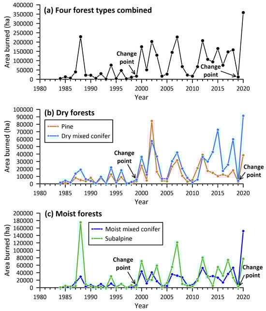Annual area burned at high severity for (a) the four forest types combined, (b) dry forests, and (c) moist forests. Two change points are shown.