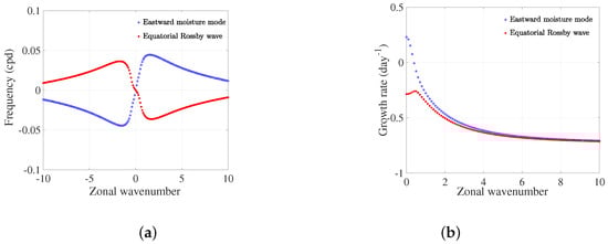 The low-frequency modes of versus k from Equation (19): when = 0.25, = −0.05, = 0.05, and = 0.04. (a) Frequency (cycles per day) of eastward mode (blue open circles) and westward mode (red dots); (b) Growth rate (day) of eastward mode (blue open circles) and westward mode (red dots).