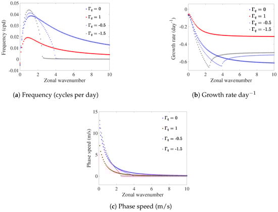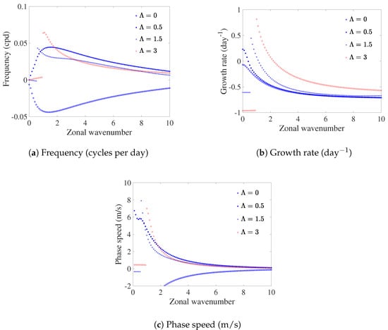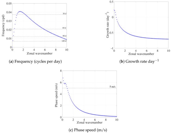 Before examining the complete dispersion relation in detail, we consider the limiting case with no feedback processes, i.e., neglecting the precipitational heating, moisture convergence ( = 1), evaporation-wind feedback ( = 0), and mechanical damping ( = 0). This approximation results in reduced classic Matsuno’s dispersion Equation () for a special case of zero meridional wind (). This dispersion relation illustrates that, in the absence of feedback processes, the solution exhibits a nondispersive eastward propagation, and this mode’s behavior closely resembles the pattern followed by the dry Kelvin mode of Matsuno [5]. Hence, we argue that the additional physical mechanisms, such as moisture feedback processes (EWF and MCF), which could provide an energy source, are required to develop an eastward instability at the planetary scale.