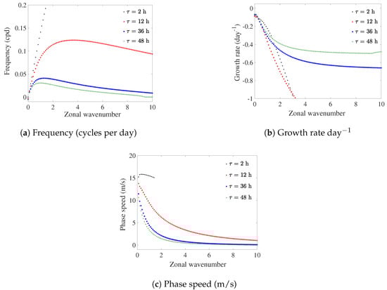 Role of MRT on eastward propagating moisture mode ( = 2 h, 12 h, 36 h, and 48 h); other parameters are fixed ( = 0.5, = −0.05).