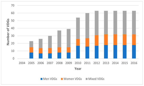 At the project level, new approaches have been followed such as proper documentation, improved communication between managerial staff and local people and marketing of rural products. At the community level, a new concept of rural revitalisation through the involvement of local people, as the main stakeholders, became possible. For the first time, village developmental groups (VDGs) were formed. These were composed solely of local stakeholders regardless of their age, gender, occupation, etc. By 2016, a total of 63 VDGs (men, women, and mixed) had formed compared to none in 2004 (Figure 1). Such a horizontal management structure created a favourable environment for decision-making, implementation of local schemes and obtaining financial gains by local people. The project’s staff acted as facilitators only in the earlier stages, paving the way for the future presence of local facilitators and organisers.