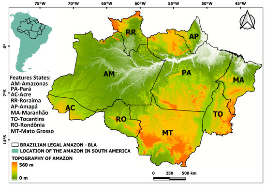 Figure 1 shows the topography and the nine Brazilian states that comprise the BLA, with seven states in the North: Amazonas (AM), Acre (AC), Roraima (RR), Rondônia (RO), Amapá (AP), Pará (PA) and Tocantins (TO); one state in the Northeast region, Maranhão (MA); and one state in the central–-west region, Mato Grosso (MT). Notably, the Amazon biome occupies only parts of some of these states, such as the western portions of MA and TO. The total area of the states that comprise the BLA is more than 5 million km2, or 59% of the Brazilian territory, with 44% of its protected area (including conservation units and indigenous lands), as part of a strategy of the Brazilian government to preserve the region [30]. The Amazon River, the main river of the BLA, discharges 12.5 million cubic meters per minute into the Atlantic Ocean, the highest average flow of a freshwater river on the planet [31].