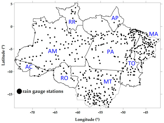 Spatial distribution of rain gauges in the BLA. The states corresponding to the acronyms can be seen in Figure 1.