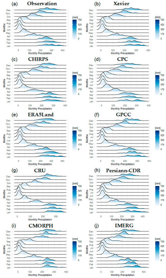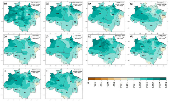 Mean annual accumulated precipitation (mm) in the BLA: (a) observed data, (b) PERSIANN-CDR, (c) CHIRPS, (d) CMORPH, (e) CPC, (f) CRU, (g) ERA5Land, (h) GPCC, (i) IMERGE and (j) Xavier. The states corresponding to the acronyms can be seen in Figure 1.