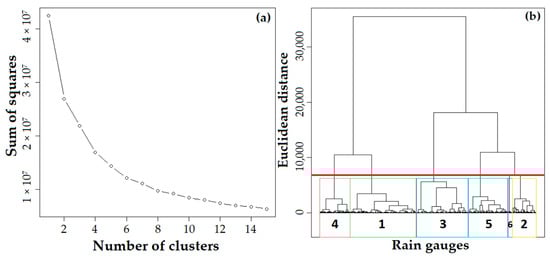 Cluster number (a) and dendrogram (b) for the six groups based on the monthly rainfall of the cluster analysis, considering the Euclidean distance and the Ward connection method for the BLA. The red line is the cut-off line that delimits the number of groups.