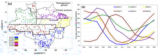 The cluster analysis was performed with the observed monthly data, providing the division of the BLA into homogeneous precipitation regions. Six homogeneous groups were identified when the sum of squares remained approximately constant (Figure 5a). This number of groups is ideal for the subdivision of the BLA because with only six groups, it is possible to identify a very peculiar region located in the extreme north of the BLA, situated between the state of RR and the extreme northwest of the MA. This result agrees with that of [99], who tested 1 to 6 groups and only identified this homogeneous region when they subdivided the BLA into six clusters, which exceeds the BLA limits towards Venezuela according to [100].