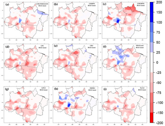 Monthly bias (mm) estimated by each database compared to observations: (a) PERSIANN-CDR, (b) CHIRPS, (c) CMORPH, (d) CPC, (e) CRU, (f) ERA5Land, (g) GPCC, (h) IMERGE and (i) Xavier.