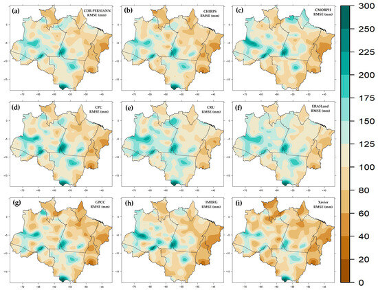 Figure 8 shows the results of the monthly RMSE between the databases and the observation. This index has the advantage of penalizing errors of greater magnitude; i.e., as the differences between the observation and the estimate increase, the RMSE increases. This is useful for identifying spatial patterns that reveal where an estimate really tends to be inaccurate. In monthly terms, the smallest errors in shades of brown (ranging from 20 to 125 mm), for all data sources, are observed in the east of the BLA, between the states of Maranhão, Tocantins, central–eastern Pará and large portions of Mato Grosso with the exception of its southernmost tip, and in Roraima and Amapá in the extreme north of the BLA. In the west of the BLA, mainly between the states of Amazonas, southwest Pará and portions of Acre and Mato Grosso, there are the nuclei with the highest RMSE values, from 125 to 300 mm. In absolute average values, Xavier (Figure 8i) with a global average of 90 mm is the database with the lowest RMSE values, and at the other extreme is CRU (Figure 8e) with 117 mm.