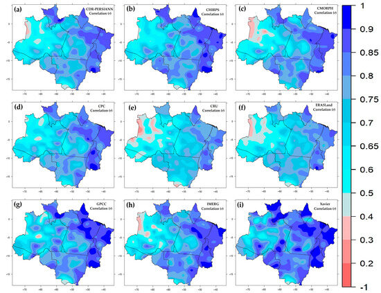 This result shows the influence that observations have on the construction of grids, since a large part of the observed data from the ANA and INMET are used in the construction of the grid analyzed by Xavier [33], while INMET observations are used in the construction of the GPCC grid and to correct the bias of satellite estimates in CHIRPS. However, these observations are also used, for example, in the construction of the CPC and CRU grids, the latter being the data source with the worst performance in terms of correlation values in most seasons, respectively (see Supplementary Material). This performance is reflected in the overall average correlations obtained for the BLA from the spatialized data in Figure 9. Among the data sources, Xavier and GPCC (Figure 9i,g), have the highest average correlations in the area with values of 0.83 and 0.80, respectively, while CRU and ERA5Land have the lowest values, with 0.70 and 0.73, respectively.