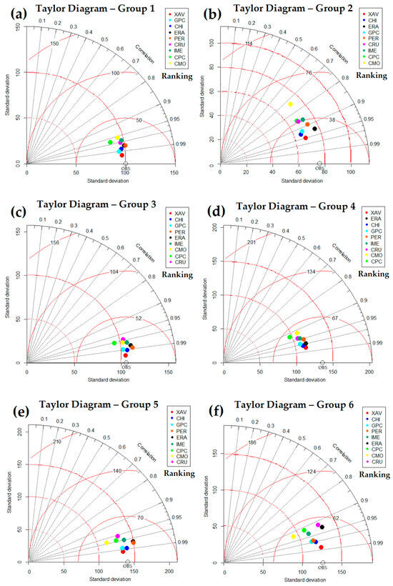 Taylor diagram for the six homogeneous precipitation groups of BLA: (a) Group 1, (b) Group 2, (c) Group 3, (d) Group 4, (e) Group 5 and (f) Group 6. The diagram shows the performance ranking of each database compared to the observation, with their respective abbreviations. The red contours indicate the SDE values in relation to the observed central value, which is 0. The standard deviation of the field estimated by the databases on the Y-axis is proportional to the radial distance from the origin, also highlighted by dotted red lines. The transparent circle on the X-axis represents the observations.