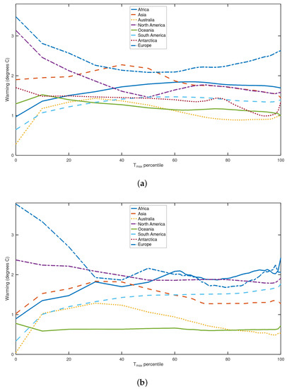 To assess the sensitivity of the amplification quantities to the choice of percentiles considered compared to the 80th () and 100th (TXx) chosen here, the continental warming between 1959 and 2021 in ERA5 was also plotted across percentiles (Figure 3). For the most part, the warming rate is a relatively smooth function of the percentile. The largest differences between TXx and the 99th percentile are seen in Antarctica and in Africa with population weighting, both of which have TXx warming faster than the less extreme 99th percentile. For the most part, the amplification factor would be similar if the typical summer temperature was taken as the 70th or 90th as opposed to the 80th percentile, although in Europe with population weighting, this would make A less positive (Figure 3b). The lowest percentiles, corresponding to winter conditions in the extratropics, warmed much faster than the median in Europe and North America but similar to or less than the median in other continents, similar to what was found in earlier work based on station data [26].