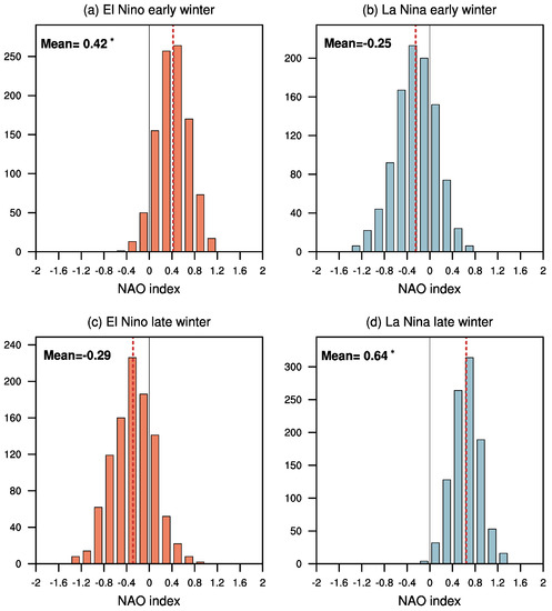 Histograms of the averaged NAO index after 1000 bootstrap resampling during (a) El Niño early winter, (b) La Niña early winter, (c) El Niño late winter, and (d) La Niña late winter. The bootstrap ensemble mean is displayed for each case with the asterisk denoting the value that is statistically significant at the 95% confidence level (also indicated by the dotted red line).