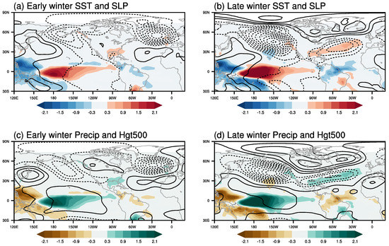 Anomalous SST (shading: °C) and SLP (contour: hPa) anomalies in (a) early winter and (b) late winter regressed upon the standardized simultaneous Niño3.4 index. Anomalous precipitation (Precip for short; shading, mm/day) and geopotential height at 500 hPa (Hgt500 for short; contour, m) in (c) early winter and (d) late winter regressed upon the standardized simultaneous Niño3.4 index. Solid lines indicate the positive values and dashed lines indicate the negative values of SLP in (a,b) and Hgt500 in (c,d). The contour interval is 0.3 hPa in (a,b) and 0.3 m in (c,d).