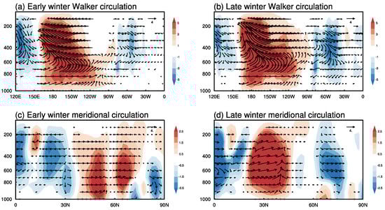 Zonal wind and vertical velocity (omega) anomalies (vector; m/s for zonal wind and Pa/s for omega) averaged meridionally over 5° S–5° N in (a) early and (b) late winter regressed upon the simultaneous Niño3.4 index. Meridional wind and vertical velocity anomalies (vector; m/s for meridional wind and Pa/s for omega) averaged zonally over 0°–50° W in (c) early and (d) late winter regressed upon the simultaneous Niño3.4 index. Omega anomalies are multiplied by a factor of −400 in (a,b) and −800 in (c,d) for display and are also shown in shading.