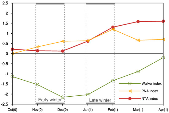 Monthly evolution of difference of the standardized Walker index (green line), PNA index (orange line), and NTA index (red line) between composite El Niño and La Niña.