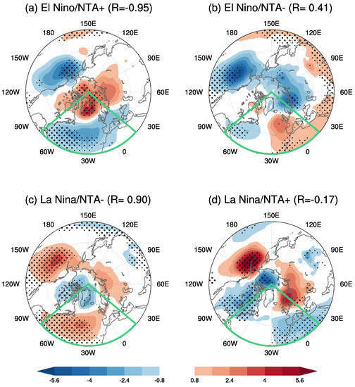 Figure 6c shows the SLP anomalies regressed on the NTA SST index. The warm NTA SST anomalies tend to be accompanied by weakened Azores High and Icelandic Low, which closely resemble the classical NAO pattern (their spatial correlation being −0.96). During El Niño in late winter, the NTA SST significantly warms (Figure 7) and alters the local atmospheric pattern, which leads to the prominent negative ENSO-NAO relationship. We further examined the role of NTA SST on the NAO phase during ENSO late winter by categorizing the ENSO events into four groups based on late winter NTA SST conditions that are El Niño with a positive NTA index, El Niño with a negative NTA index, La Niña with a positive NTA index, and La Niña with a negative NTA index (Table 1). The El Niño events with warm NTA SST anomalies show a significant negative NAO pattern (Figure 8a), while the El Niño events with cold NTA SST anomalies exhibit no significant NAO-related atmospheric anomaly pattern (Figure 8b). Similarly, the La Niña events with opposite-signed NTA SST anomalies are characterized by a distinct atmospheric response over the North Atlantic. The La Niña events with negative NTA SST anomalies correspond to a positive NAO pattern. However, the La Niña events with warm NTA SST anomalies are accompanied by a weakened meridional gradient of atmospheric pressure, with the centers being shifted eastward relative to the conventional NAO pattern. Therefore, the negative ENSO-NAO relationship can be detected considering that most ENSO years are concurrent with the same-signed NTA SST anomalies. The above results again support that the winter NTA SST variability during ENSO years plays an important role in leading to a remarkable shift in the North Atlantic atmospheric pattern towards an opposite NAO response in late winter compared to that in early winter.