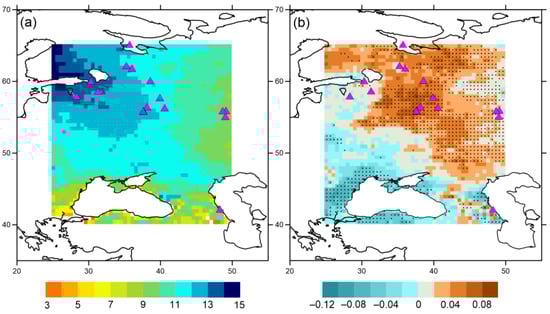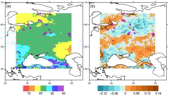 Number of days with relative humidity over 80% (a) and trends (b) for period 1961–2020. Black dots correspond to statistically significant values (p < 0.05). Purple triangles—cultural heritage sites.