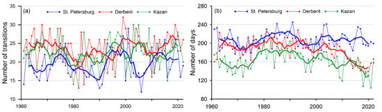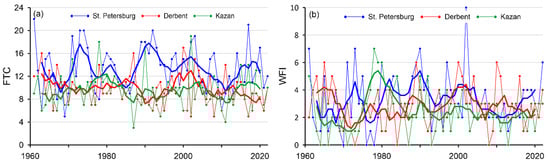 Number of FTC (a) and WFI (b) for three cities located in different climatic conditions for period 1961–2020. Bold line—5-year moving average.