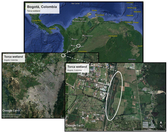 The Torca wetland is located in the middle of the localities of Suba and Usaquén, belonging to the megacity of Bogotá, Colombia (4°47′05″ N–74°02′23″ W), to the north of South America. The study ecosystem is located on the side of the North Highway with 220th Street (Figure 1). The wetland is shallow (<1.5 m) and high mountain (2553 masl). The wetland has an area of 0.90 ha and is supplied by the Aguas Calientes, Patiño, and San Juan streams. These three streams constitute the main inputs of water and pollution (point sources) to the wetland. The Torca wetland also enables ecological connectivity with the Guaymaral wetland. In addition, because it is located in the Sábana geological formation (layers of sand on the surface), it has a great hydrogeological value, as it is part of primary porosity aquifers and it has become a habitat for aerial fauna in danger of extinction [30]. The urban wetland under study currently faces problems associated with its fragmentation, which has reduced the water body size and its water depth. A significant percentage of wetland area was filled with solid waste, and dried for urban expansion processes and agricultural activities [31]. The sediment and nutrient transport from the watershed and exposed surfaces near the wetland also generated clogging and eutrophication processes. This further decreased its water storage capacity. The wetland also receives a significant volume of urban wastewater [31]. All of the above characteristics are why this urban wetland was selected for our study.