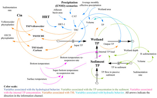 Figure 2 shows the Forrester diagram designed for the development of the wetland trophic status dynamic model under ENSO conditions. The results showed that during the ENSO scenarios considered (El Niño-2001 and La Niña-2011), significant variations in the magnitude of precipitation were observed. The weak El Niño phase (2001) showed a reduction in annual precipitation of 34.7% (573 mm) compared to the historically reported annual average (878 mm) [44]. The results of the dynamic modelling suggested for this period an HRT of 1.47 months in the study wetland. In other words, the wetland renewed its water volume every 44 days. This, for an inflow into the wetland of 760,096 m3/year, which came entirely from the basin. In contrast, the strong La Niña phase (2011) showed an increase in annual precipitation of 53.9% (1904 mm) in relation to the historically reported annual average [44]. Under this scenario, the simulated HRT in the wetland was 1.10 months. During this period, the wetland renewed its volume of water every 33 days. This, for an inflow into the wetland of 2,524,506 m3/year, which came entirely from the basin. The simulation results suggested that HRT in the wetland was increased by 1.33 times during the weak El Niño phase (decreased precipitation) compared to the strong La Niña phase (increased precipitation). Indeed, the precipitation and inflow into the wetland also varied according to the ENSO phases considered. On average, precipitation and inflow were 3.32 times higher during the La Niña phase.