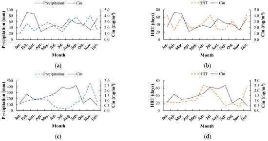 Monthly modeling of precipitation, input TP concentration (Cin), and HRT, in the study wetland under the ENSO phases of El Niño (a,b) and La Niña (c,d).