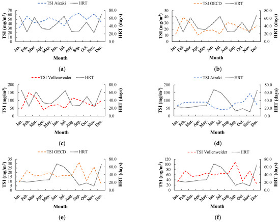 Dynamic modelling of TSI-OECD, TSI-Vollenweider, TSI-Aizaki, and HRT, in the study wetland, for the ENSO phases of El Niño (a–c) and La Niña (d–f).