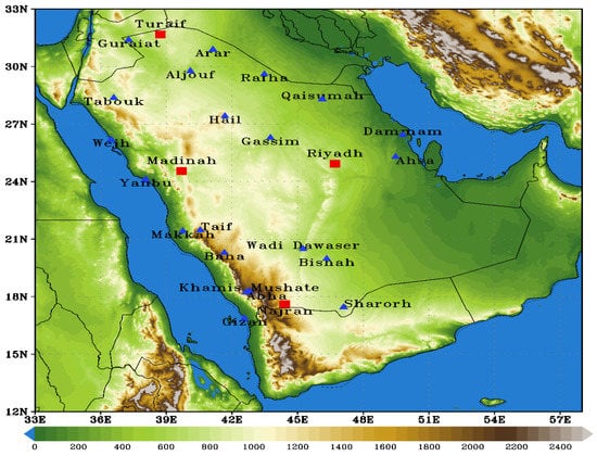 The name and location of Saudi Arabia stations are marked by blue triangles with shaded elevations (m). The red mark represents the stations that were used to evaluate the ERA-5 data.