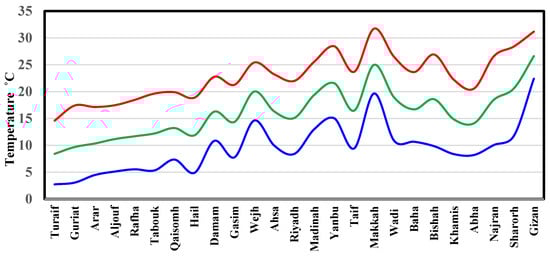 The average of mean (green line), maximum (red line) and minimum (blue line) values of air temperature of Saudi Arabia stations during the winter. The stations are arranged from north to south.